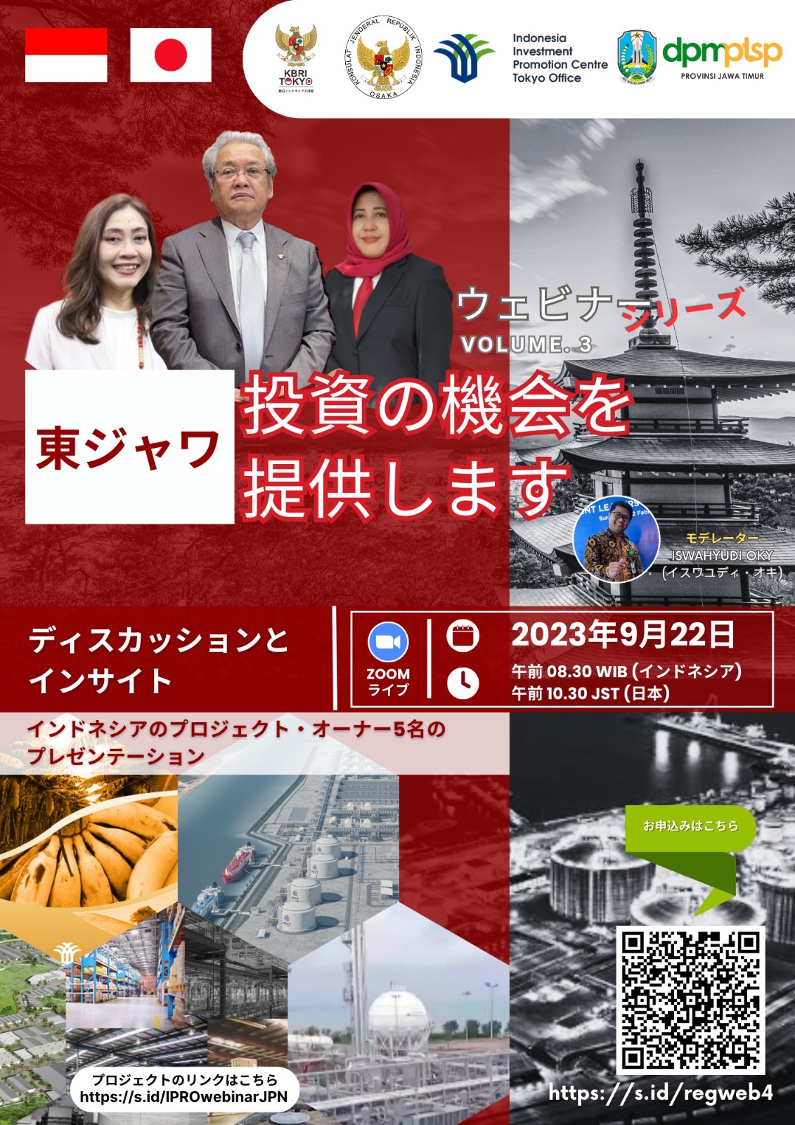 【終了】2023年9月22日「東ジャワ州 投資の機会を提供します」ウェビナー開催By / (このイベントは終了いたしました) 9月22日10時30分(日本時間)より、在京インドネシア共和国大使館主催ウェビナーシリーズの第3段として「東ジャワ州 投資の機会を提供します」が開催されます。 ジャカルタや西ジャワに続いて日本企業が多く集積する「東ジャワ州」のポテンシャルを改めてご紹介させていただきます。 奮ってご参加ください。 お申し込みフォーム プロジェクトご案内